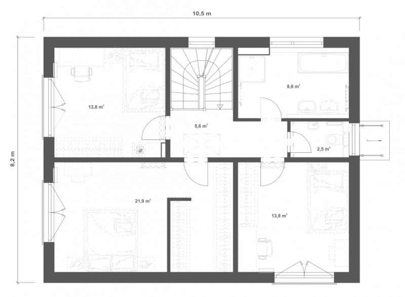Dům Family 135 zaujme moderním designem, který je ideální také pro menší pozemky. Tento kompaktní dům nabízí promyšlenou otevřenou dispozici s velkými prosklenými plochami, které se rozprostírají přes obě podlaží, tím přinášejí dostatek světla do obývací, jídelní i kuchyňské části. Velké prosklené dveře vedou přímo na prostornou terasu, což je ideální místo pro relaxaci a společenská setkání. V poschodí se nachází ložnice s krásným výhledem a další dvě prostorné místnosti, které poskytují klid a naprosté soukromí. Tento dům dokonale spojuje moderní estetiku s praktickými potřebami rodiny, což z něj činí skvělou volbu pro pohodlné rodinné bydlení.